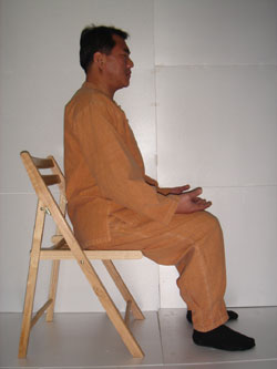 ▲동작설명=의자에 앉는다(등을 붙이지 않는다)양발을 옆으로 벌리고, 손은 무릎 위에 올려놓으며 상체를 바르게 한다.